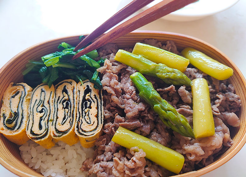 メインはまずお肉を入れた後、アスパラを乗せて、彩りよく。海苔巻き卵で仕切りをして、ホウレン草とモヤシをサイドに配置しました。